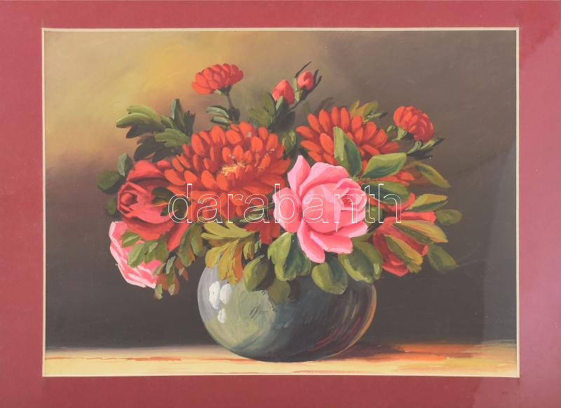 Leírás: Jelzés nélkül: Virágcsendélet. Gouache, papír. Paszpartuban, fólia alatt. 24x32 cm.