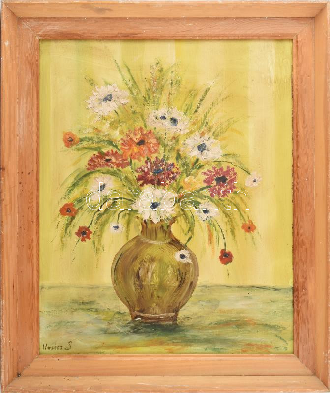 Leírás: Kovács S jelzéssel: Csendélet. Olaj, farost. Fakeretben. 50×40 cm