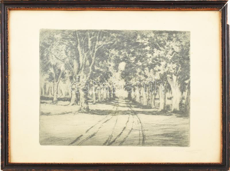 Leírás: Olvashatatlan jelzéssel: Erdei út. Rézkarc, papír. Üvegezett, sérült fakeretben. 19x24,5 cm