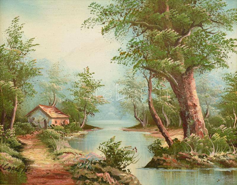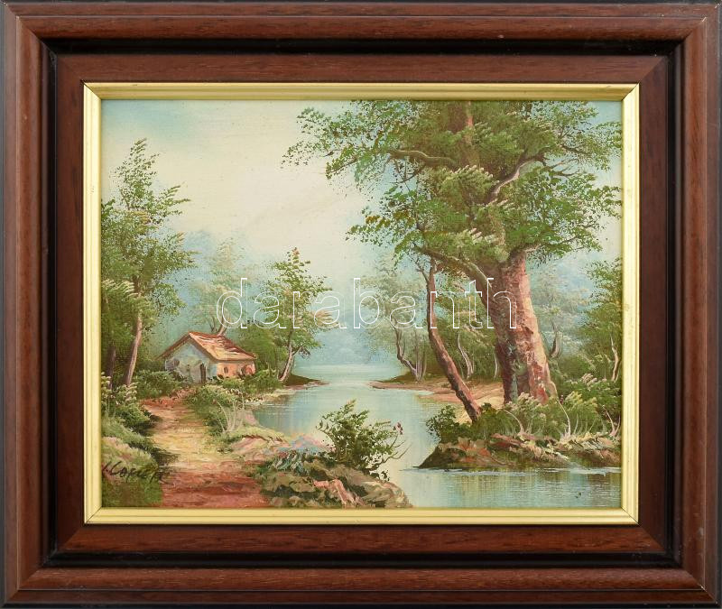 Leírás: Olvashatatlan jelzéssel: Házikó a vízparton. Olaj, farost, fakeretben. 20x25 cm