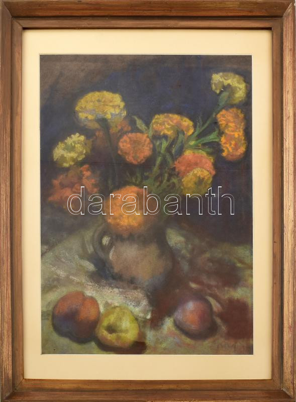 Leírás: Olvashatatlan (?) jelzéssel (jobbra lent?): Csendélet. Pasztell, papír. Üvegezett fakeretben, 50×35 cm