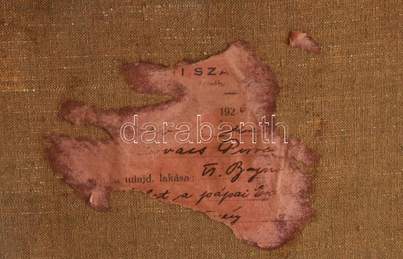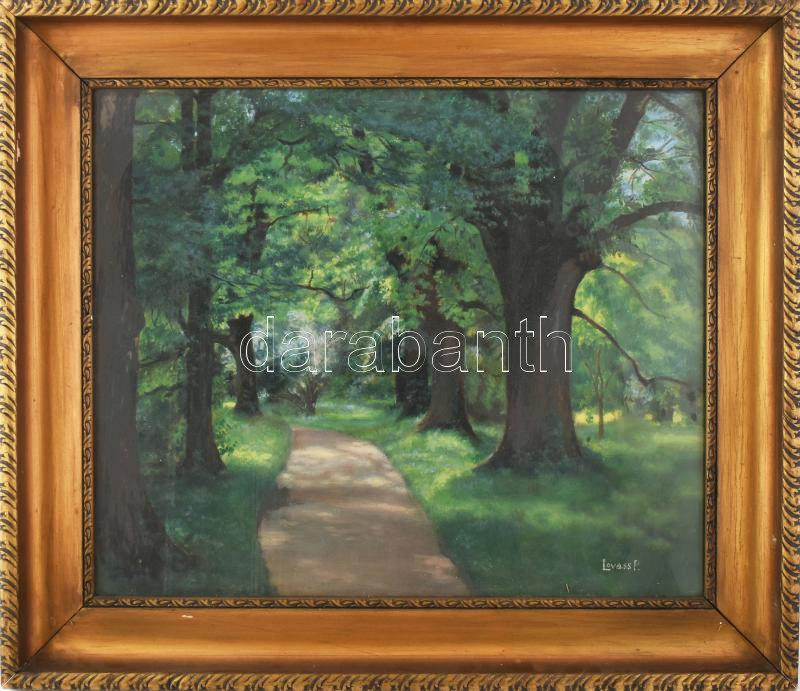 H. Lovass Piroska, működött a XX. sz. első felében: Erdőrészlet (Pápa). Olaj, vászon. Jelzett. Hátoldalán Nemzeti Szalon 1930-40 körüli töredékes raglapjával. Üvegezett, dekoratív, kissé kopott fakeretben, 50×60 cm