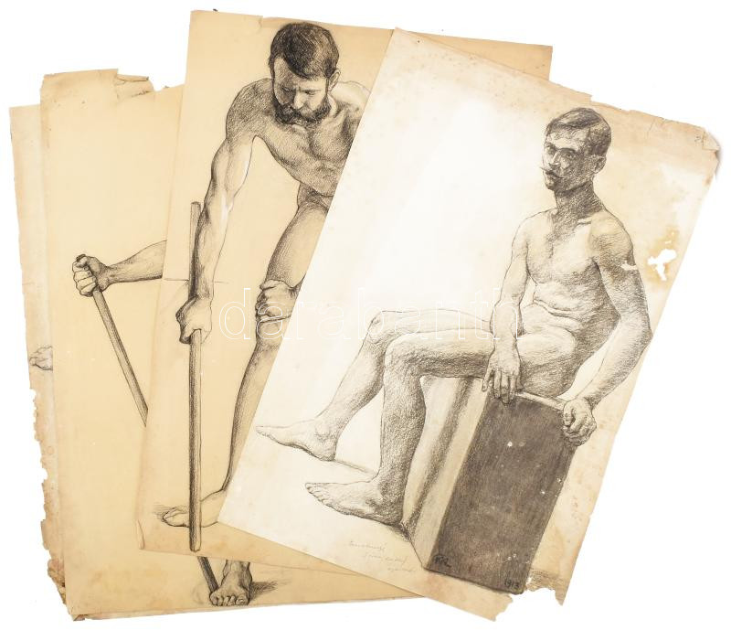 Kézdi-Kovács Lóránt (1897-1916), 4 db mű: Férfi aktok, 1913-14. Szén, papír, mindegyik jelzett. Proveniencia: a művész hagyatéka. Mindegyik sérült és foltos. 60x40 cm körüli méretekben. Kézdi-Kovács Lóránt mindössze 19 évesen, 1916-ban az I. világháborúban esett el, amelynek következtében az életműve is nagyon korán lezárult. Munkái nagyon ritkán tűnnek fel a műkereskedelemben, igazi gyűjtői darab!
