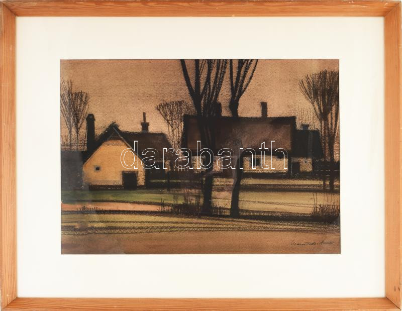 Leírás: Marostordai Anna (1920-1999): Eső után. Vegyes technika, papír, jelzett, hátoldalán Képcsarnok Vállalat címkéjével, üvegezett fakeretben, 33x48 cm