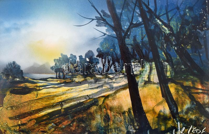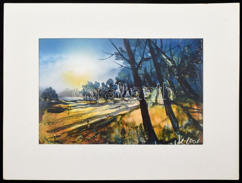 Leírás: Mezős Béla (1949- ): Erdőszéle (cím nélkül). Akril, karton. Jelzett, a hátoldalon a művész bélyegzőjével, paszpartuban, 20,5x28 cm