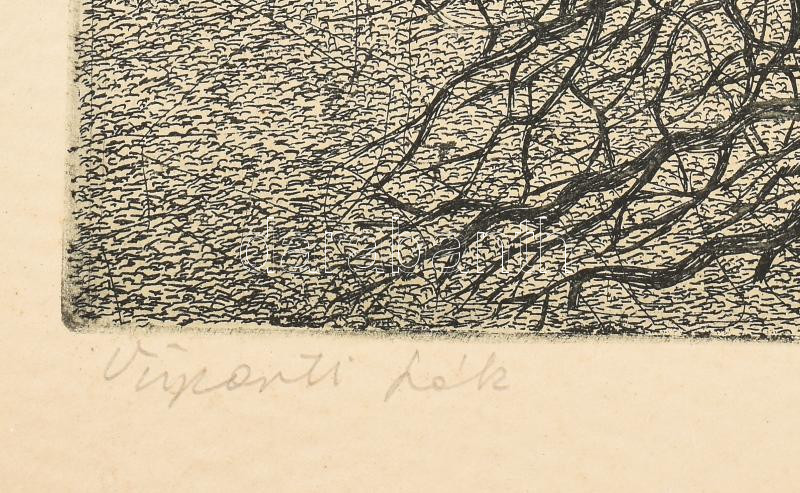 Leírás: Nyári Lóránt (1928-1982): Vízparti fák. Rézkarc, papír, jelzett, kartonra kasírozva 29,5x49 cm