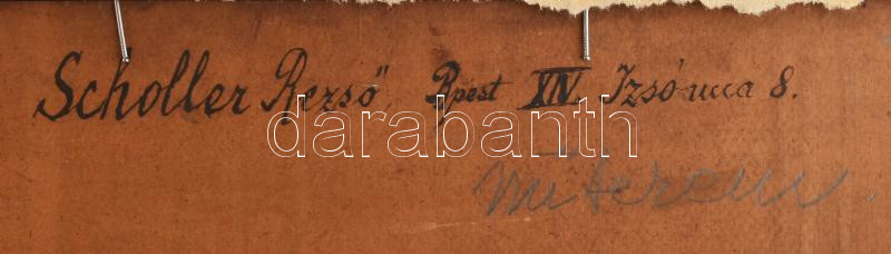 Leírás: Scholler Rezső (1882-?): Téli utca. Olaj, karton, jelezve balra lent, hátoldalán autográf felirattal és Téli Kiállítás, Műcsarnok, 1937 raglapjával. Fakeretben. 34x49 cm