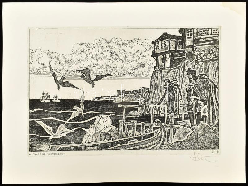 Leírás: Stettner Béla (1928-1984): A bújdosó fejedelem. Rézkarc, papír, jelzett, sarkán folttal, 20x29 cm