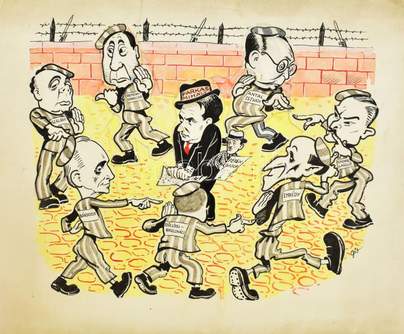 Szegő Gizi (1902-1985): Politikai karikatúra (szélső-)jobboldali, nyilas és kommunista politikusokról (Szálasi, Farkas Mihály, Bárdossy, Imrédy, Péter Gábor stb.), 1946 körül. Vegyes technika, kollázs, papír, jelzett. Lapszéli sérüléssel. 25x31 cm