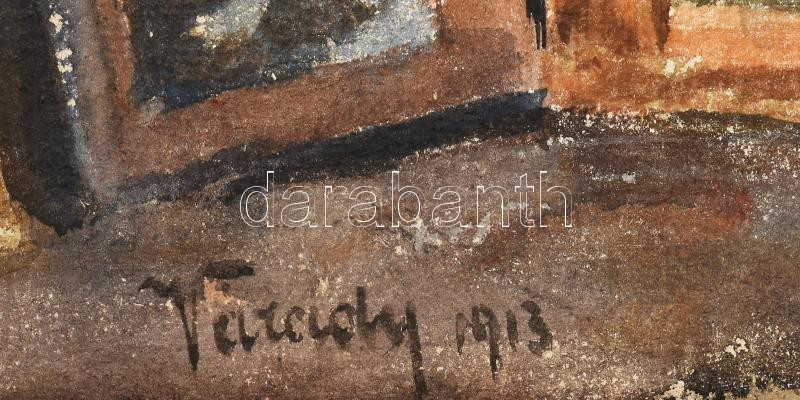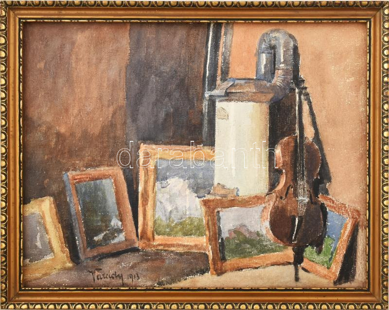 Leírás: Várady Gyula (1866-1929): Enteriőr festményekkel és hangszerrel, 1913. Akvarell, papír. Jelzett. 27,5×25,5 cm. Fakeretben.