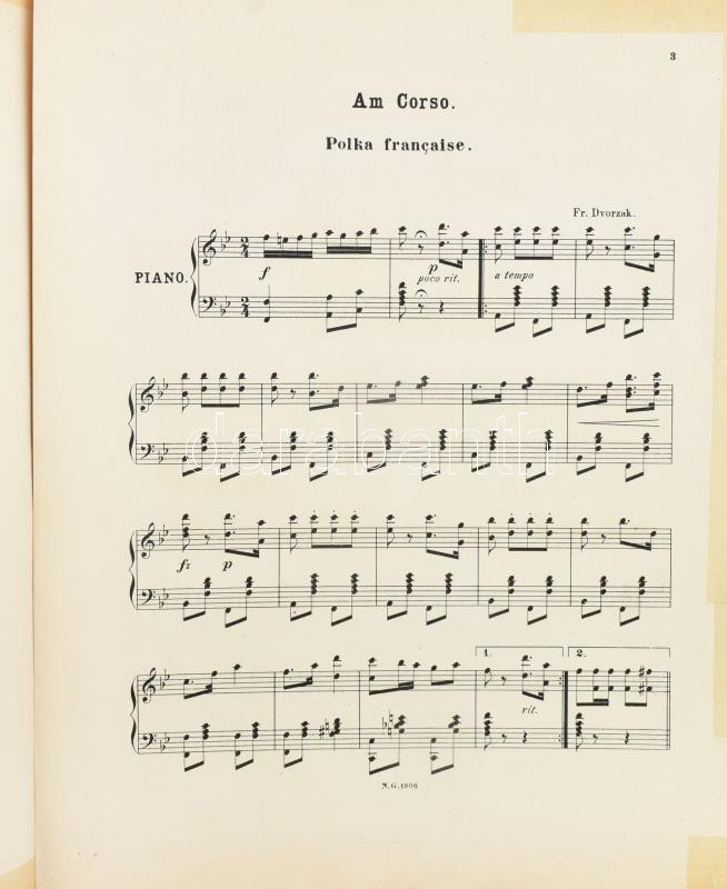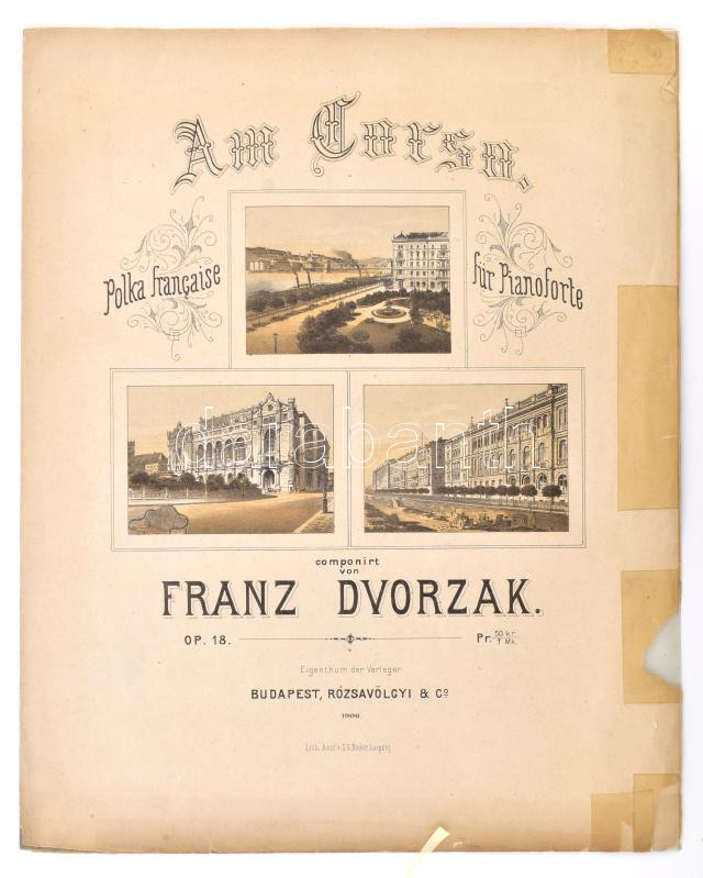 1906 Franz Dvorzak: Am Corso Polka francaise für pianoforte. Componirt von - -. Op. 18. Bp., 1906, Rózsavölgyi, 5+1 p. A címlapon budapesti Dunakorzó, a Vigadó és a Thonet-ház színes litografált képével, javított lapokkal, 6,5x8,5 cmx3, lapméret: 34x27 cm