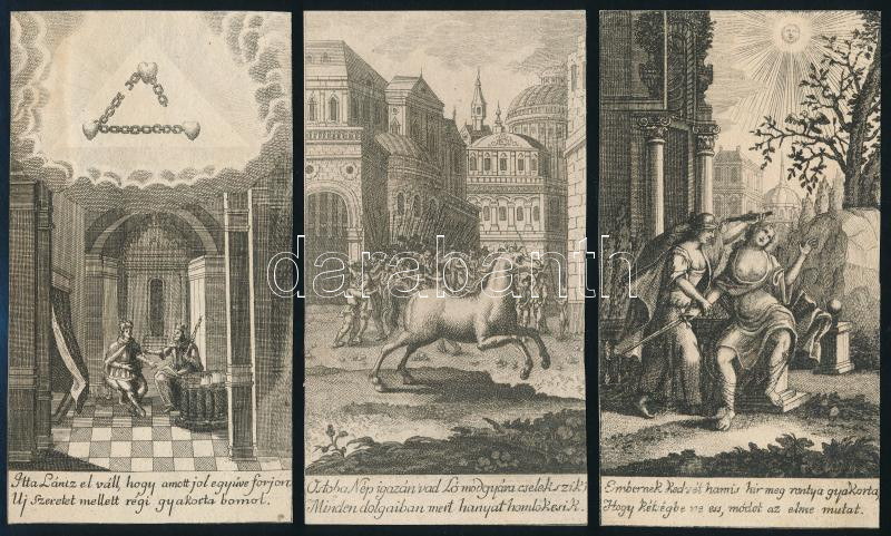 Leírás: cca 1750 6 db magyar nyelvű, rézmetszetes könyv illusztráció egy könyvből 8,5x15 cm
