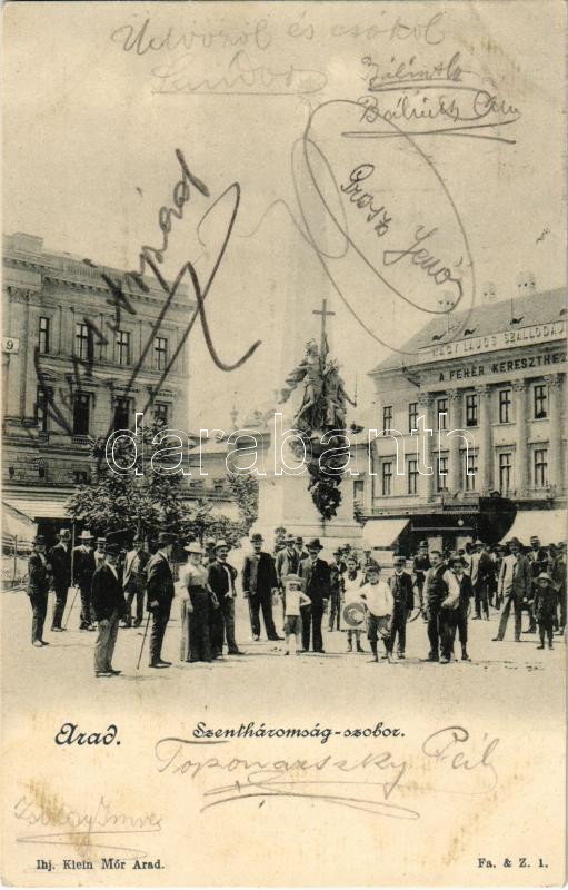 1903 Arad, Szentháromság szobor, Nagy Lajos szállodája a Fehér kereszt... https://www.darabanth.com/hu/448-Gyorsarveres/448.0/Kepeslapok/Erdely~1500006/1903-Arad-Szentharomsag-szobor-Nagy-Lajos-szallodaja-a-Feher-kereszthez-Holy-Trinity-statue~II2959882
