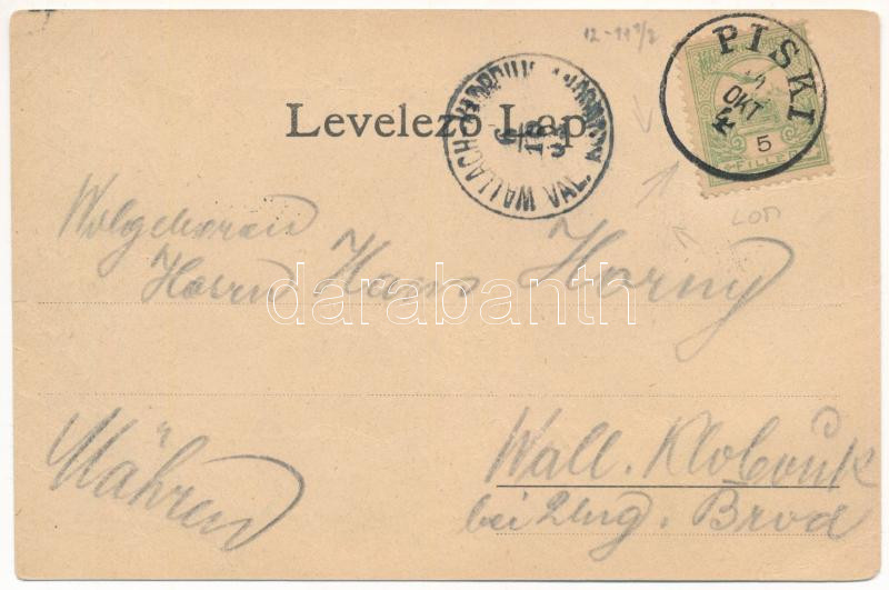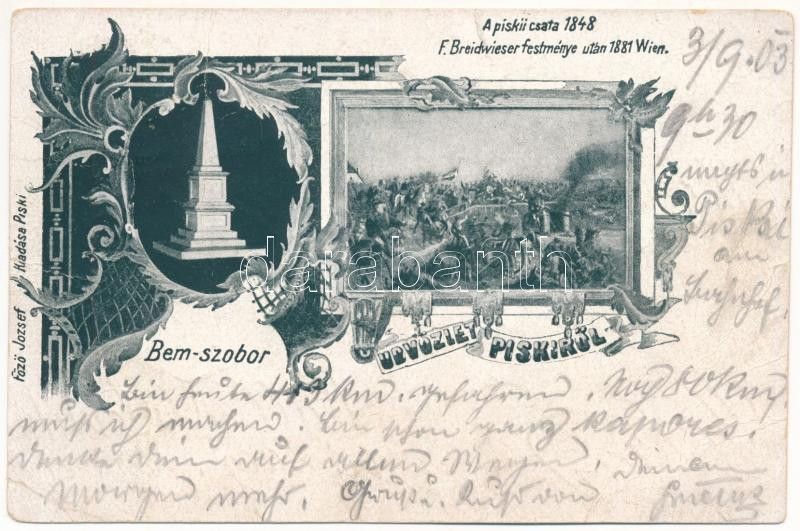 1903 Piski, Simeria; A piski csata (F. Breidwieser festménye után), Bem-szobor, emlékmű. Főző József kiadása / Hungarian Revolution of 1848, Battle of Simeria (1849), monument. Art Nouveau, floral (szakadás / tear)