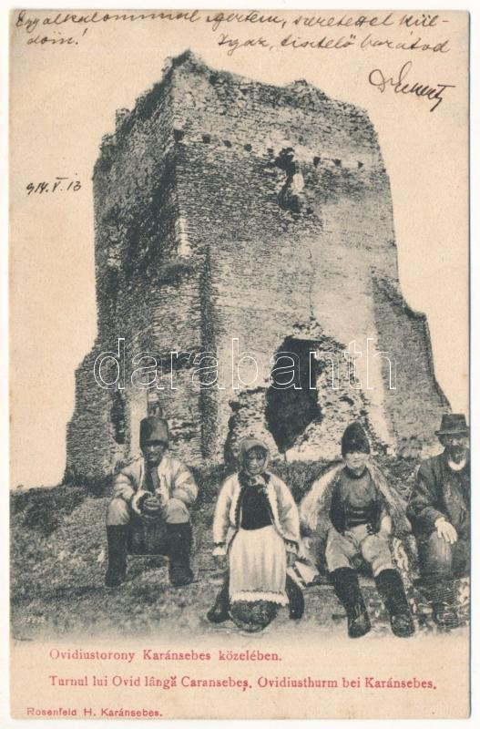 Leírás: 1914 Sebesrom, Sebestorony, Rujen, Turnu Ruieni (Karánsebes); Ovidius torony falubeliekkel. Rosenfeld H. kiadása / Turnul lui Ovid langa Caransebes/ castle ruins, folklore