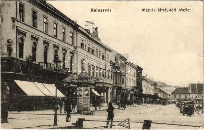 1916 Kolozsvár, Cluj; Mátyás király tér, hirdetőoszlop, Schuster Emil üzlete, Mezőgazdasági Bank, Hanitz Sándor könyvkötészete / square, advertising column, bank, book shop