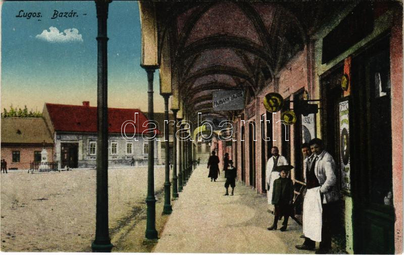 Leírás: 1919 Lugos, Lugoj; bazár, Faimann Lajos üzlete, fodrász / bazaar, shops, hairdresser