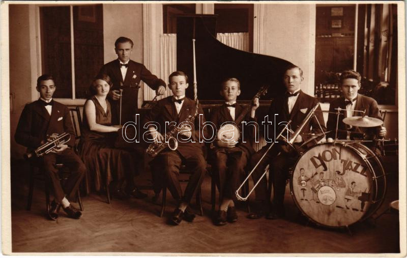 1930 Nagyvárad, Oradea; Lyon Jazz zenekar / music band. photo https://www.darabanth.com/hu/448-Gyorsarveres/448.0/Kepeslapok/Erdely~1500006/1930-Nagyvarad-Oradea-Lyon-Jazz-zenekar-music-band-photo~II2968291