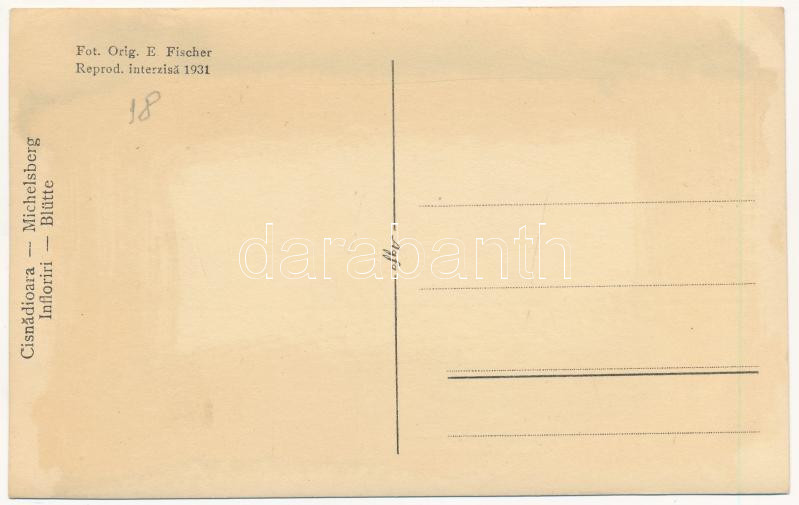 Leírás: Kisdisznód, Michelsberg, Cisnadioara; Infloriri / Blütte / Tavasz / spring. Fot. Orig. E. Fischer 1931. (fl)