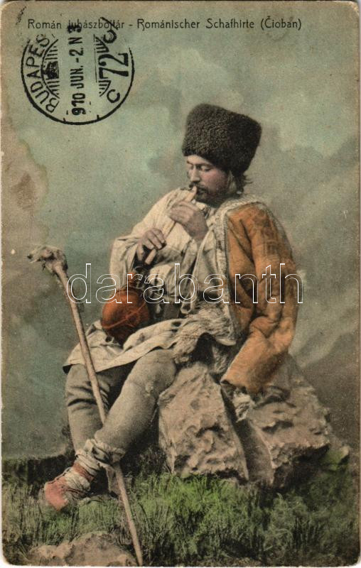 1910 Román juhászbojtár / Romänischer Schafhirte (Cioban) / Romanian f... https://www.darabanth.com/hu/448-Gyorsarveres/448.0/Kepeslapok/Folklor~1500057/1910-Roman-juhaszbojtar-Romanischer-Schafhirte-Cioban-Romanian-folklore-shepherd~II2968418