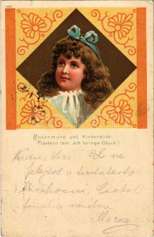 Leírás: 1900 Rosenmund und Kinderblick, Flüstern leis ich bringe Glück! / Children art postcard, girl with ribbon. litho (EK)