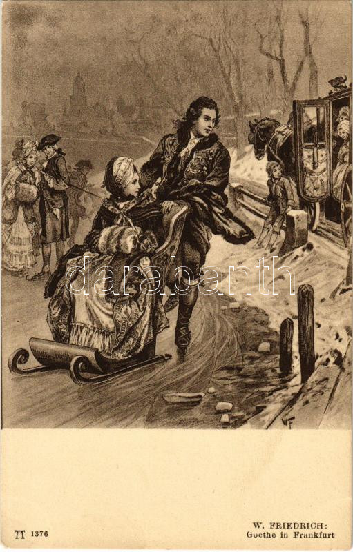 Leírás: Goethe in Frankfurt with lady on ice. F. A. Ackermann's Kunstverlag Serie 108. Goethe's Leben (12 Karten) s: W. Friedrich