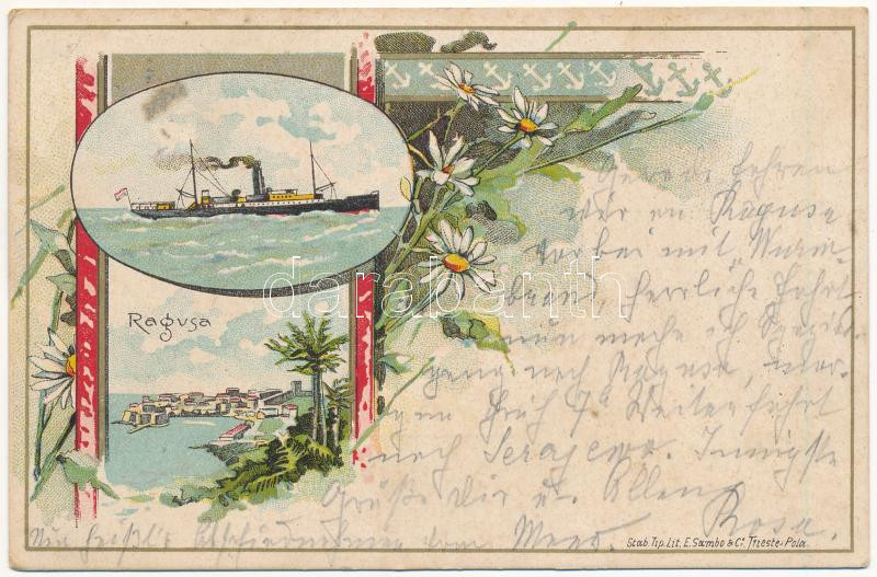 Leírás: 1906 Dubrovnik, Ragusa; gőzhajó / steamship. E. Sambo & Cie Art Nouveau, floral, litho
