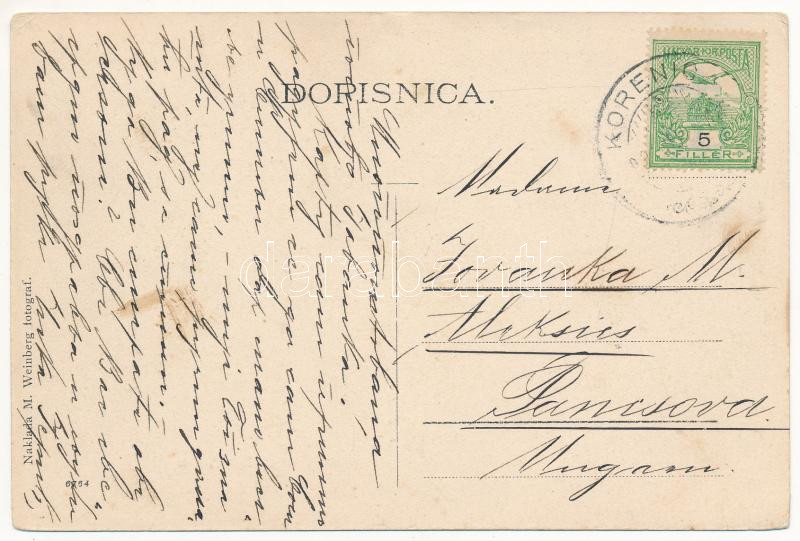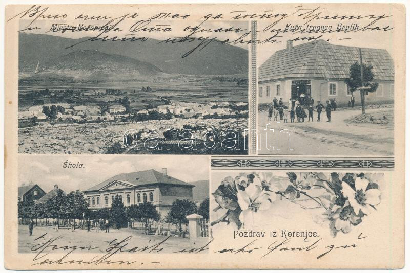Leírás: Korenica (Plitvicka Jezera), Skola, Mjesto, Kuca trgovca Jure Brolih / iskola, Jure Brolih üzlete / general view, school, shop. M. Weinberg fotograf. Art Nouveau montage, floral (EK)