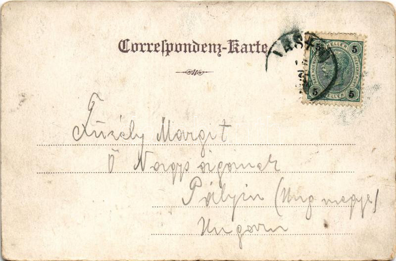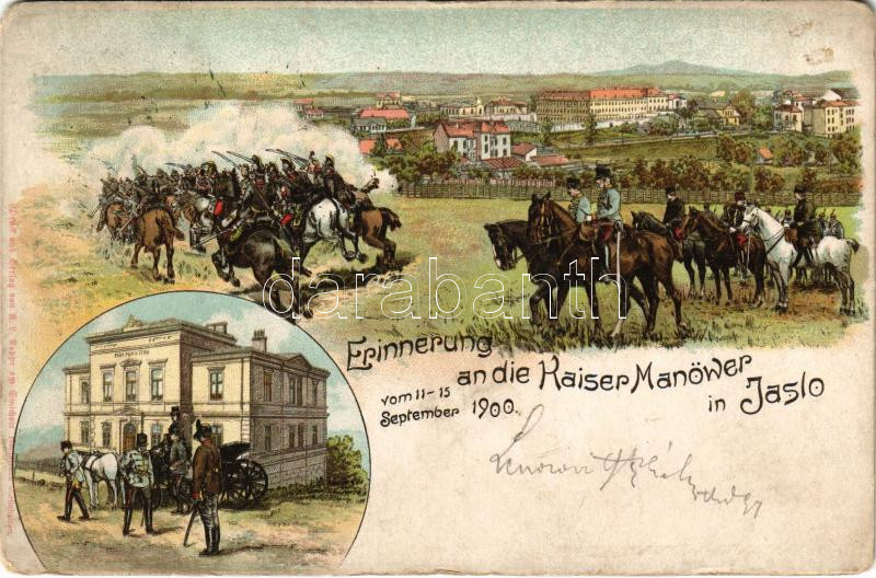 1900 Erinnerung an die Kaiser Manöver in Jaslo vom 11-15 September / Az 1900-as Császári hadgyakorlatok emlékéül Jaslo-ban Ferenc József jelenlétében / In memory of the royal maneuvers and the presence of his Majesty the Emperor Franz Joseph I of Austria. Art Nouveau, floral, litho (kopott sarkak / worn corners)