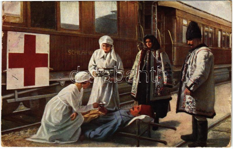 1915 Weltkrieg 1914-1917. Österreichischer Sanitätszug in der Bukowina / WWI Austro-Hungarian K.u.K. military art postcard, hospital train in Bukovina, injured soldier with Red Cross nurses (EK)