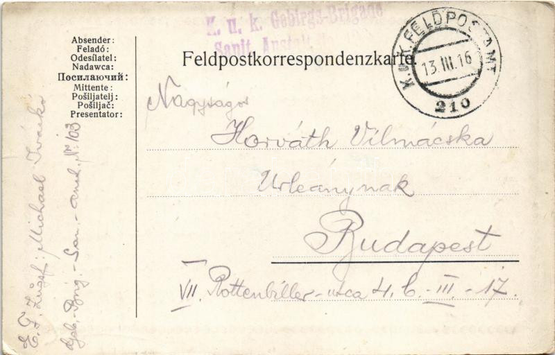 Leírás: 1916 Isonzo-Armee 1915 feliratú jelvény képe tábori levelezőlapon / WWI Austro-Hungarian K.u.K. military badge on a field postcard + "K.u.K. Gebirgs-Brigade Sanit. Anstalt. No. 103." (EK)