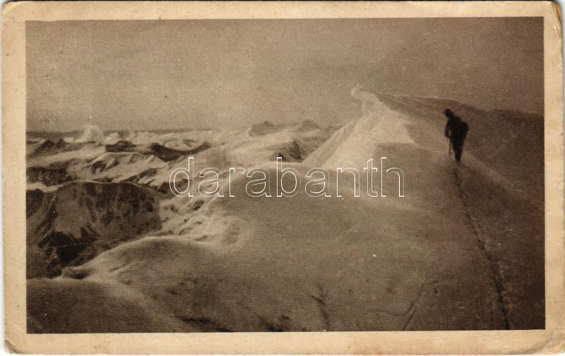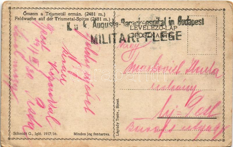 1917 Triumetál, Hruby Wierch, Hruby vrch (Magas Tátra, Vysoké Tatry); Őrszem a Triumetál ormán / Feldwache auf der Triumetal-Spitze / Straznik na konciavy Triumetal / WWI Austro-Hungarian K.u.K. field guard on the mountain peak + "K.u.K. Augusta-Barackenspital in Budapest Militärpflege" (ázott sarkak / wet corners)