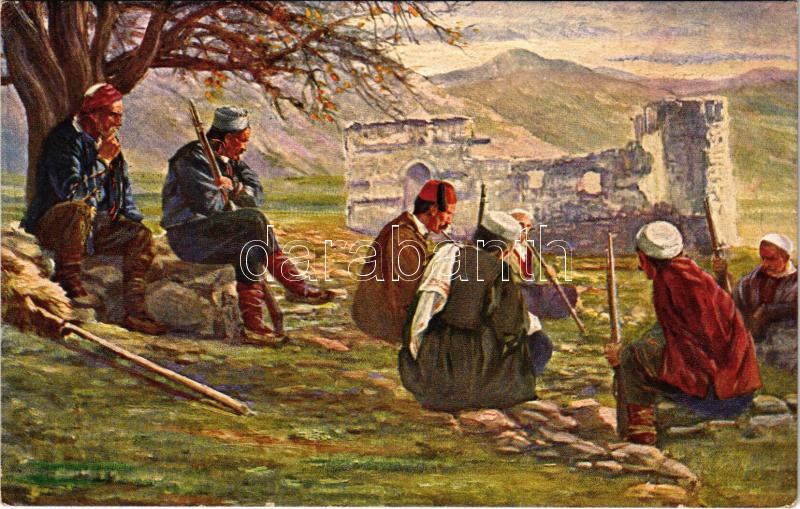 Leírás: 1917 Weltkrieg 1914-1916 Kriegsrat albanischer Stammeshäuptlinge / WWI K.u.K. (Austro-Hungarian) military art postcard