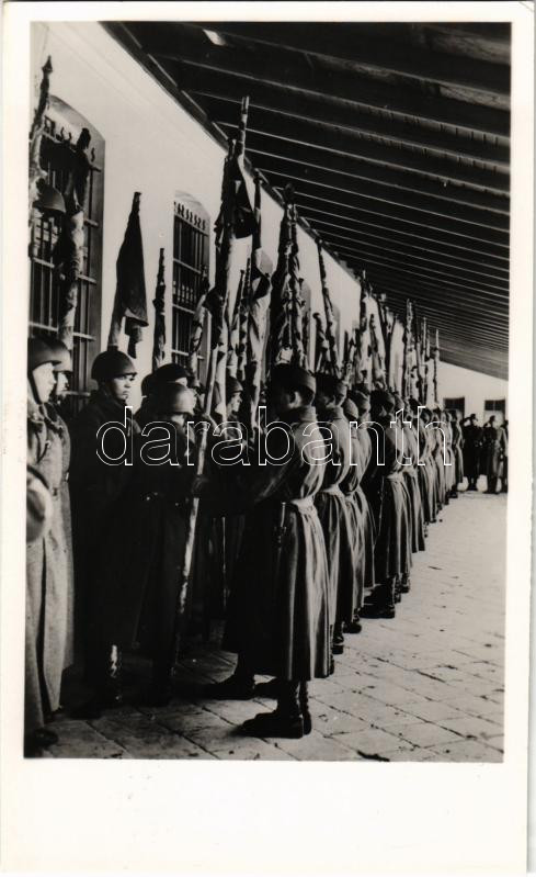 1941 Lavochne, Lavoczne; az 1848-49-es szabadságharci zászlók ünnepélyes hazahozatala Oroszországból. A magyar honvéd zászlótartók a vasútállomáson / Russia returns the flags of the 1849-49 Hungarian war of independence, railway station