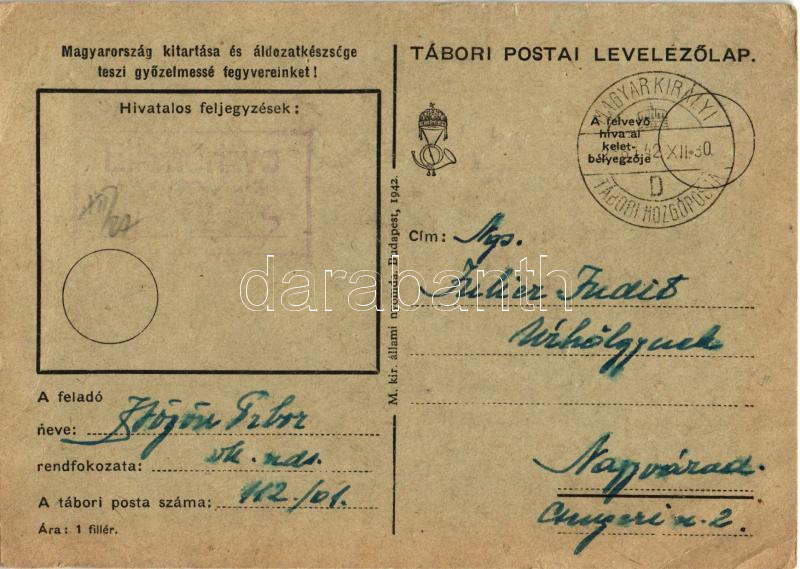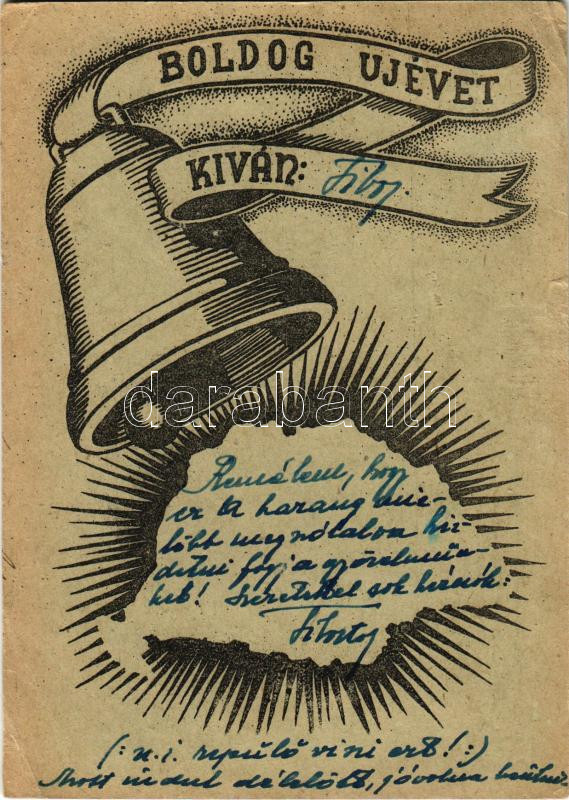 1942 Boldog Újévet kíván. Tábori postai levelezőlap Nagymagyarország térképével / WWII Hungarian military field post, New Year greeting, irredenta + "MAGYAR KIRÁLYI TÁBORI MOZGÓPOSTA" (szakadás / tear)