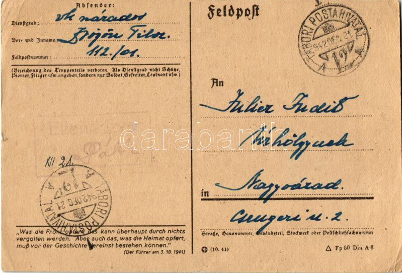 1942 Kriegsweihnacht. Feldpost / Második világháborús magyar tábori posta, katonai karácsonyi üdvözlet / WWII Hungarian military field post, Christmas greeting (EK)