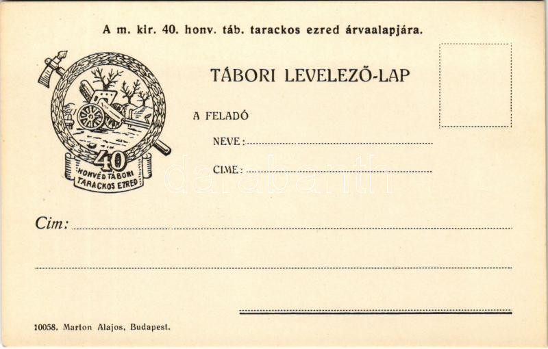 Leírás: A m. kir. 40. honvéd tábori tarackos ezred árvaalapjára. Tábori Levelezőlap / WWI Austro-Hungarian K.u.K. military field postcard, charity fund