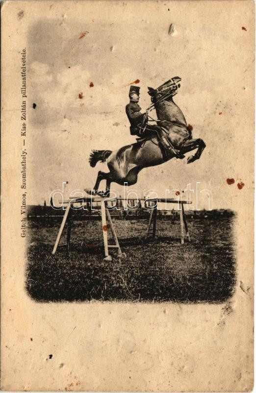 Szombathely, Magyar huszár akrobatikus gátugrása lóval a Lovassági laktanyában. Geltch Vilmos kiadása, Kiss Zoltán pillanatfelvétele (apró lyukak / pinholes)