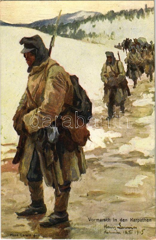 Vormarsch in den Karpathen. Offizielle Karte für Rotes Kreuz, Kriegsfürsorgeamt, Kriegshilfsbüro Nr. 394. / WWI Austro-Hungarian K.u.K. military art postcard, soldiers in the Carpathians s: Hans Larwin