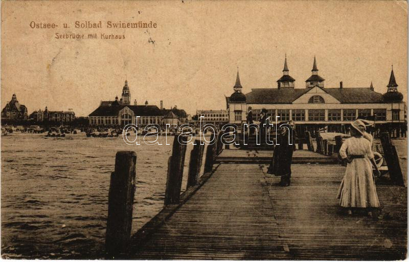 Leírás: 1927 Swinoujscie, Swinemünde; Ostsee u. Solbad, Seebrücke mit Kurhaus / pier, bath, spa, beach,. Verlag Arthur Schuster