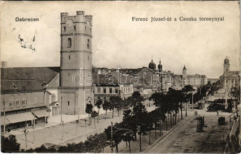 1915 Debrecen, Ferenc József út, Csonka torony, villamos, Jakab kalap ... https://www.darabanth.com/hu/448-Gyorsarveres/448.0/Kepeslapok/Magyarorszag~1500013/1915-Debrecen-Ferenc-Jozsef-ut-Csonka-torony-villamos-Jakab-kalap-aruhaza~II2171255