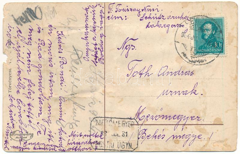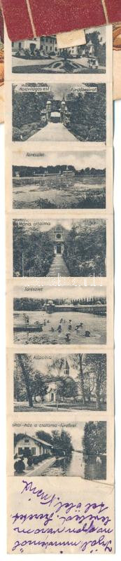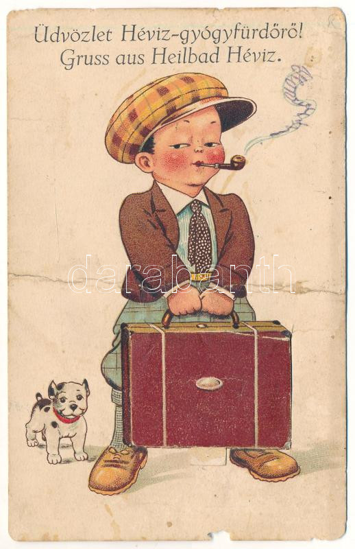Leírás: 1934 Hévíz-gyógyfürdő. Leporellolap nyaraló kisfiúval pipával a szájában + "MEZŐMEGYER POSTAI ÜGYN." (fa)