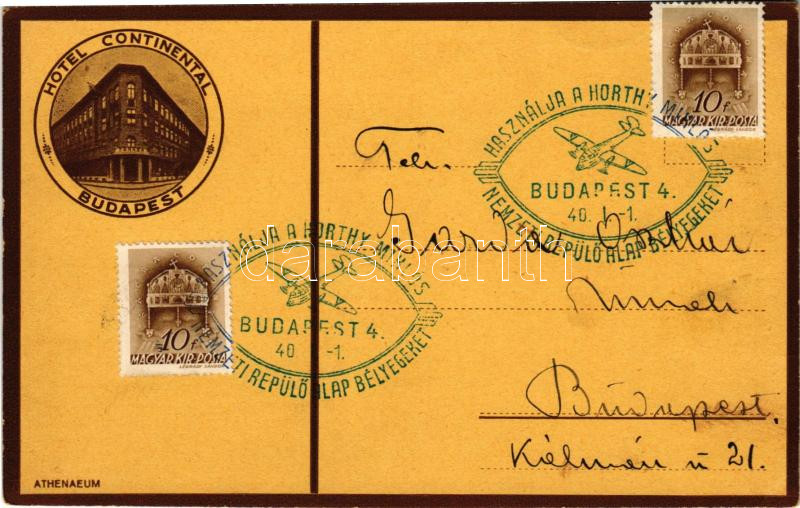 Leírás: 1940 Budapest V. Hotel Continental szálloda reklámlapja + "1940 Használja a Horthy Miklós Nemzeti Repülőalap bélyegeket" So. Stpl (EK)
