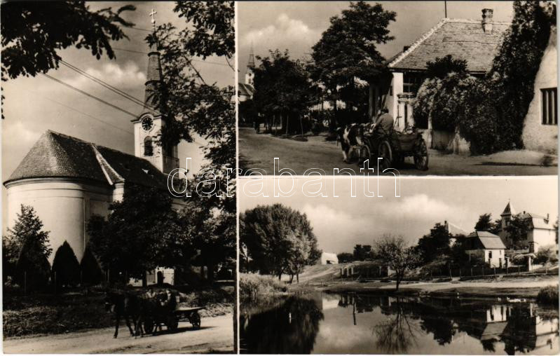 Leírás: ~1963 Veresegyház, utca, lovaskocsik, tó. Képzőművészeti Alap