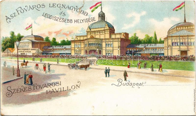 Leírás: Budapest XIV. Városliget, Székesfővárosi Pavilon, Bokor János vendéglője, étterem, Weingruber Ignác kávéháza, kerékpárosok, hintó. Kosmos litho (b)