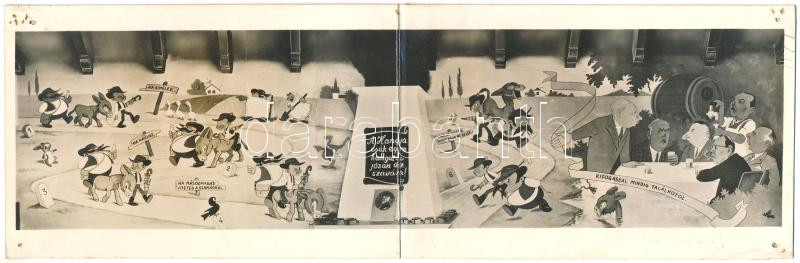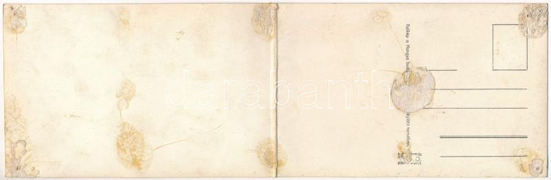 Leírás: Budapest XXII. Budafok, Hangya budafoki borpincészetének faliképe. 2-részes kinyitható humoros panorámalap, Horthy arcképével s: Vasi (ragasztónyomok / gluemarks)
