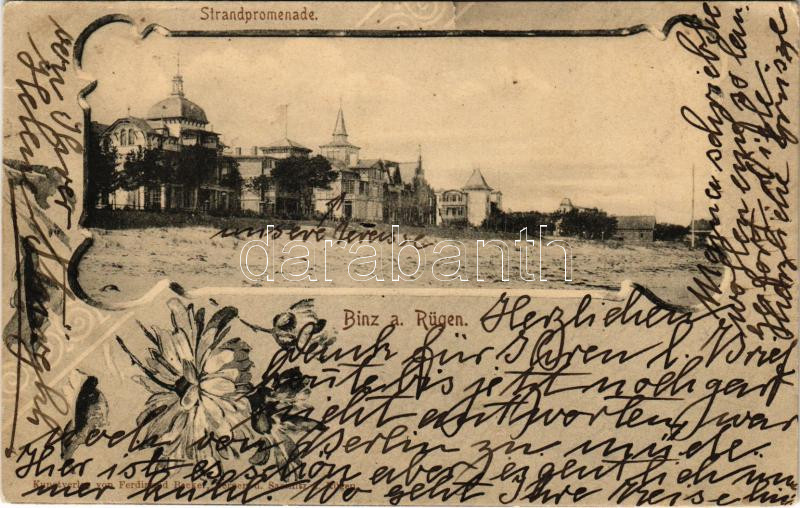 Leírás: 1902 Binz, Binz auf Rügen; Strandpromenade / beach, promenade, villas. Kunstverlag von Ferdinand Becker. Art Nouveau, floral (wet damage)