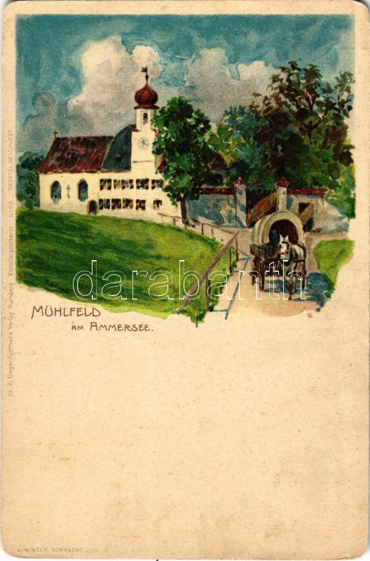 Leírás: Mühlfeld am Ammersee, Herrsching am Ammersee; church, horse-drawn carriage. Fz. X. Gegenfurtner's Verlag Starnberg. Künstlerpostkarte No. 28. litho (EK)