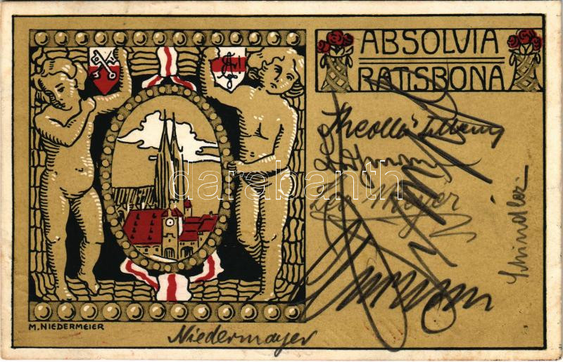 1911 Absolvia Ratisbona / Regensburg grammar school art postcard with signatures of students and the artist, coat of arms. Studentica, golden, litho. s: M. Niedermeier (EK)