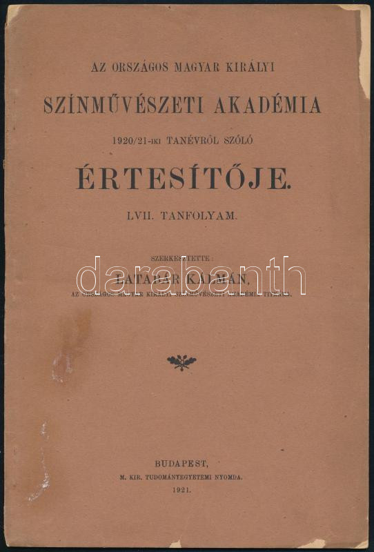 1921 Szerk.: Latabár Kálmán: Az Országos Magyar Királyi Színművészeti Akadémia 1920/21-iki tanévről szóló értesítője. Bp.- M. Kir. Tudományegyetemi Nyomda, 1921. Kiadói papírkötésben, kopottas enyhén szakadt azonban a lapok jó állapotban vannak.